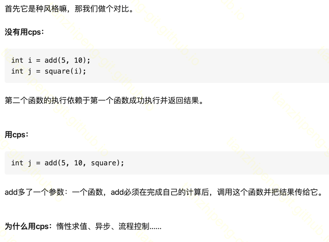 函数式编程虽然没怎么用过, 但也知道意思. 有一种函数式风格的写法: continuation, cps, 之前没有用过, druid查询里用到了, 看起来很费劲, 我借用一个知乎回答解释一下cps吧: