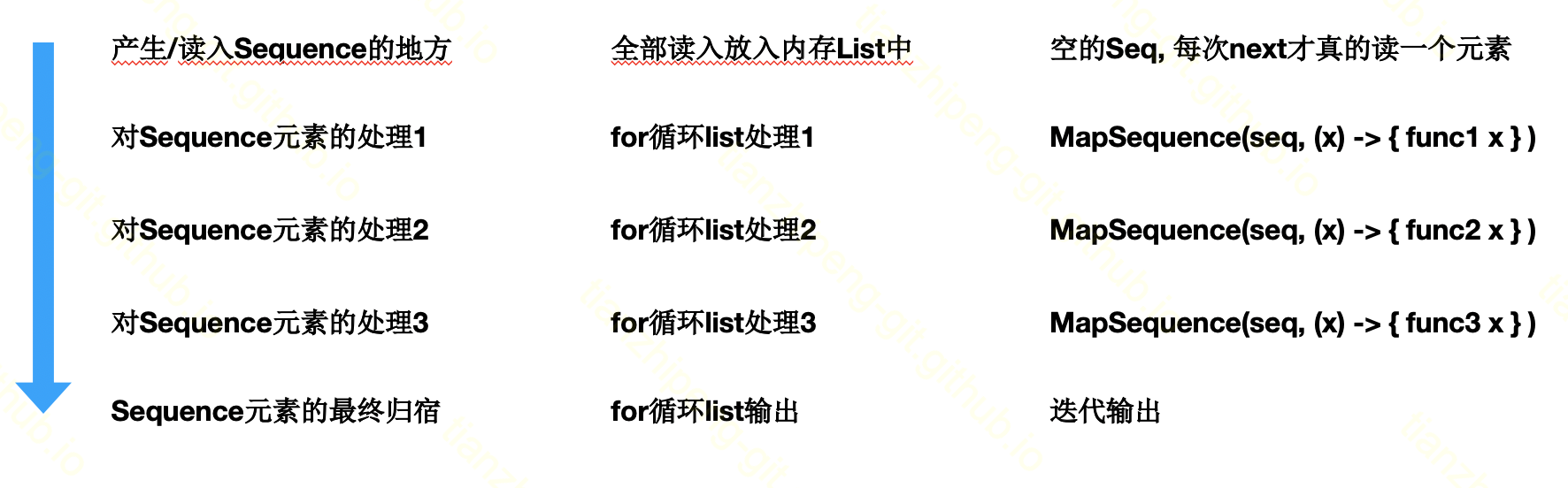 最左侧一列是我们需要的处理流程. 中间一列是我们一般情况下的代码写法, 先把所有数据读进来放到内存里, 比如一个list结构中, 然后一遍遍的遍历和处理最后写出. 这里的问题在于, 如果数据量特别大, 这种方式就特别消耗内存.