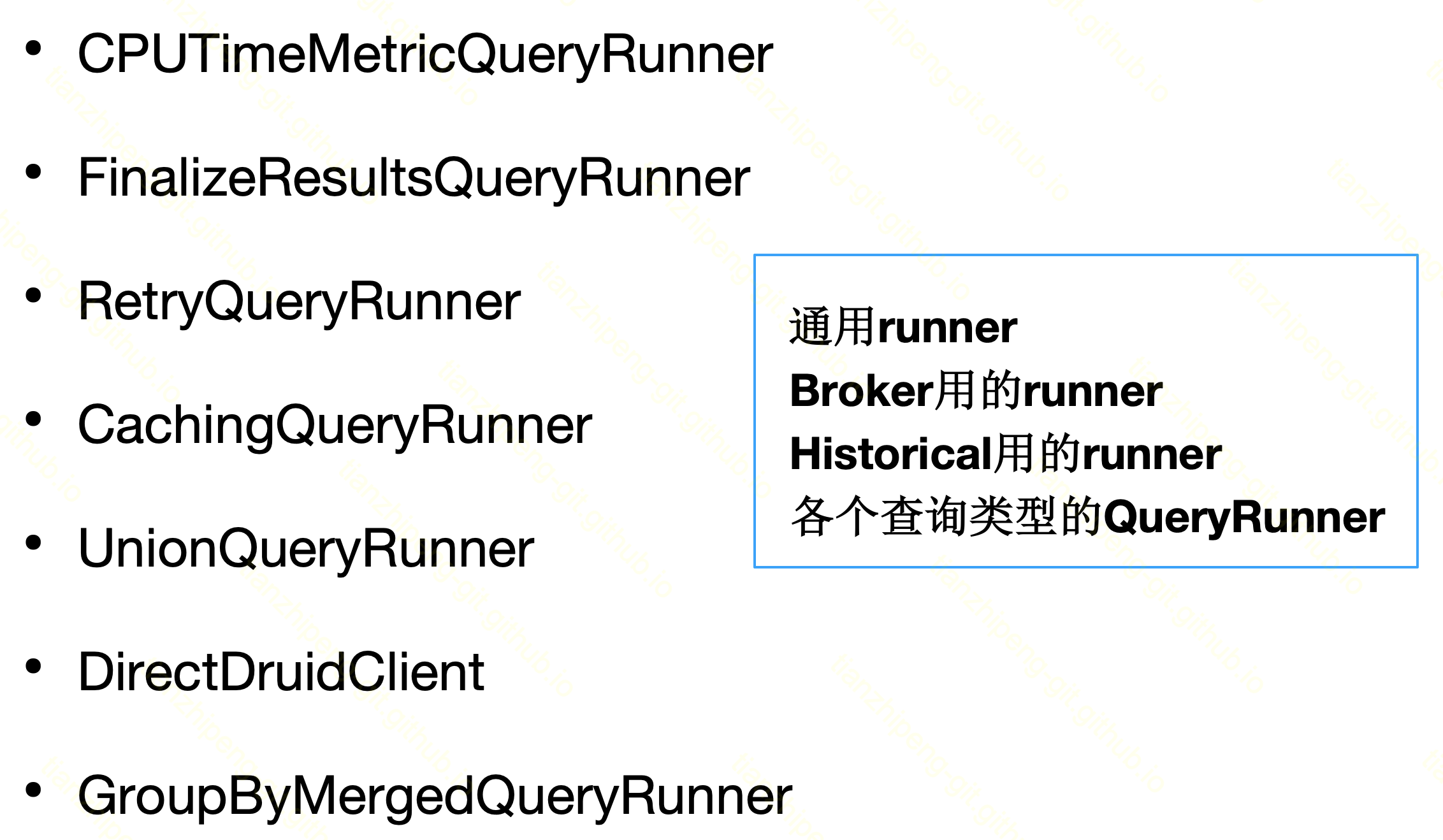 QueryRunner是各种真实的逻辑, 有各种超多的runner, 见下面的图. SegmentWalker是组织queryRunner的. 比如查询刚来的时候,broker和historical是一样的,但其实之后的逻辑不一样就是在这里变化的. 这两个主要是和查询类型无关的, 和节点类型(Historical还是Broker)有关的逻辑.