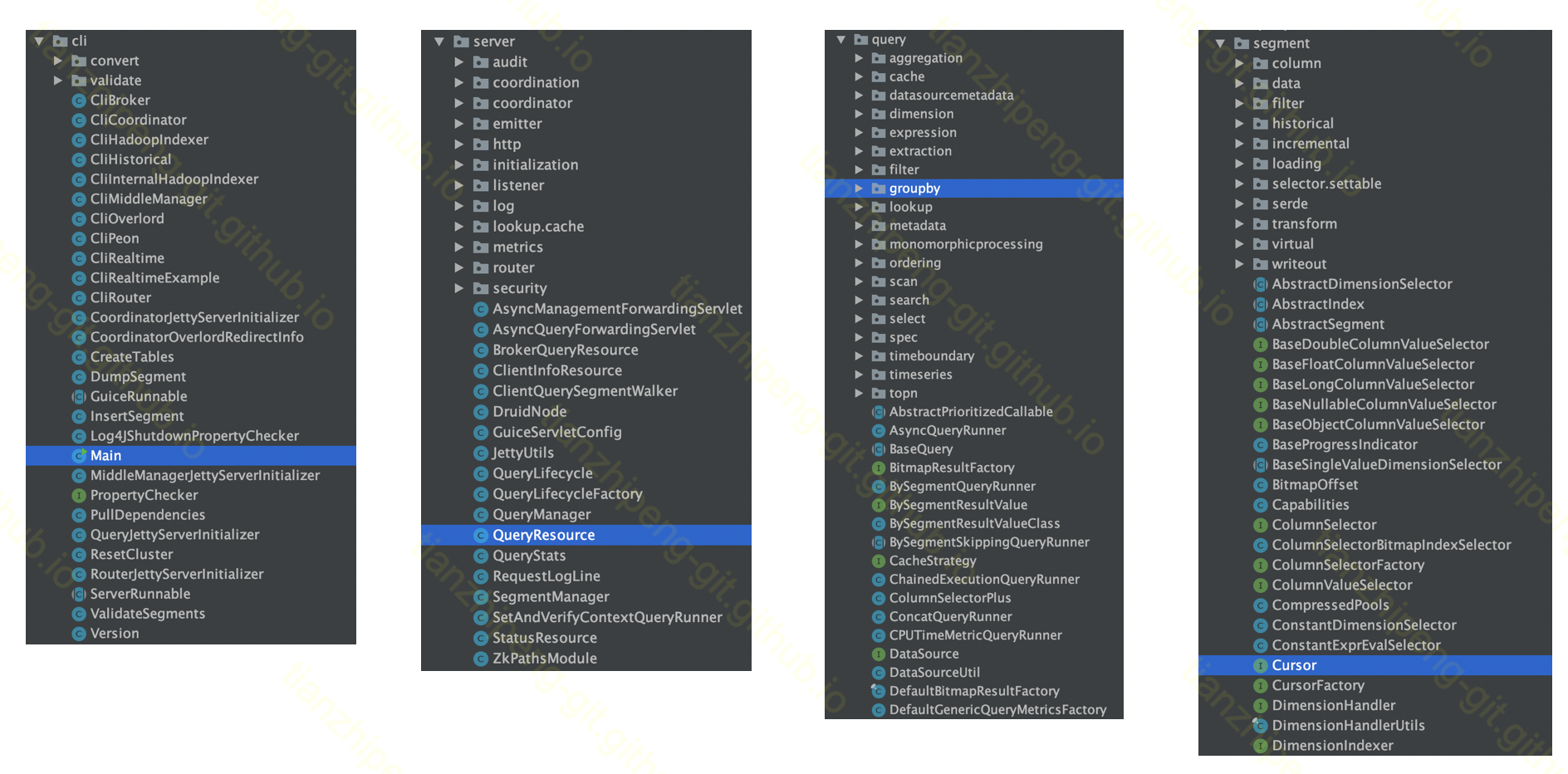 不过这里可以看出, 刚才提到的broker,historical等等节点, 代码基本上是混在一起的, 并不是按节点分package, 这个给我们看代码造成了一定障碍.