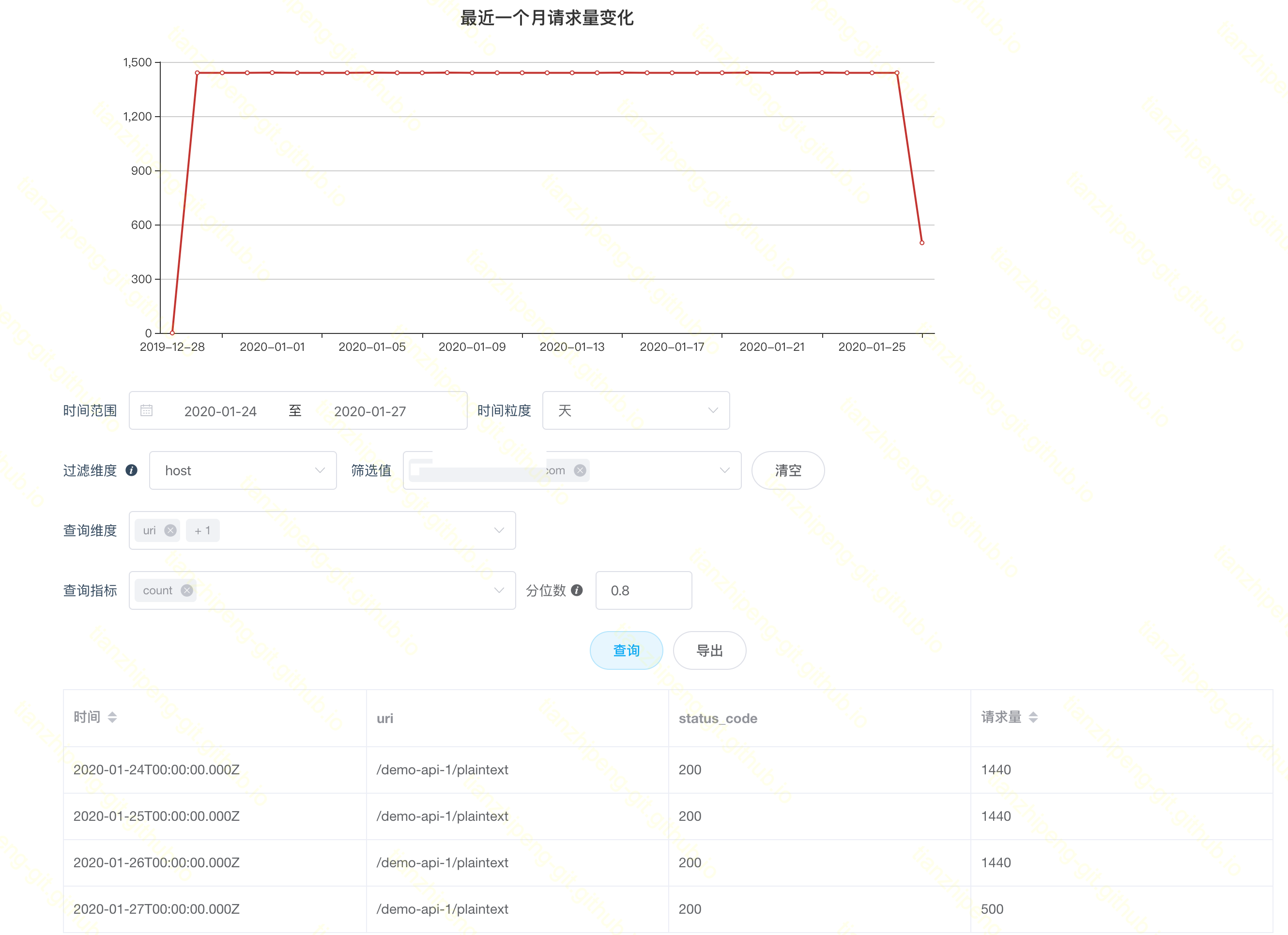 如图是Aster日志报表页面. 上面是一个月查询量变化, 下面是自定义查询表.