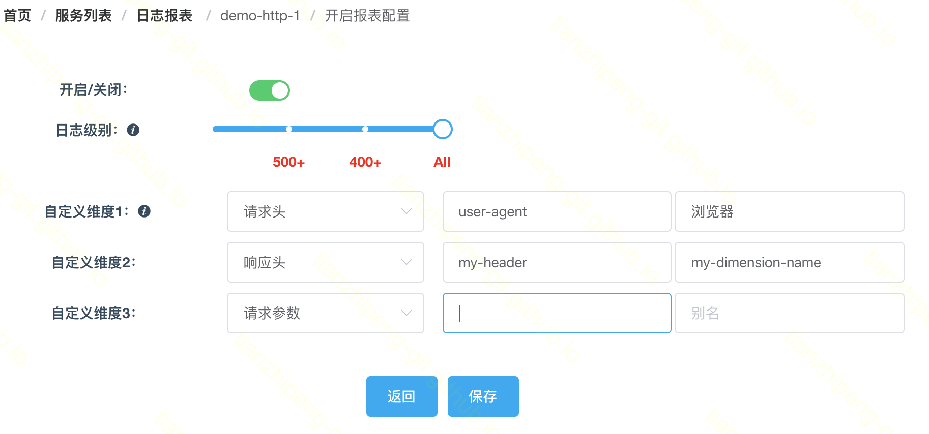 而维度有些特殊, 默认定义的维度有: 请求服务名(service), 请求域名(host), uri, 响应状态码, 请求方法, 后端服务ip端口等, 除了这些固定的维度, Aster还支持将3个用户自定义的参数作为报表维度, 如下图的配置.