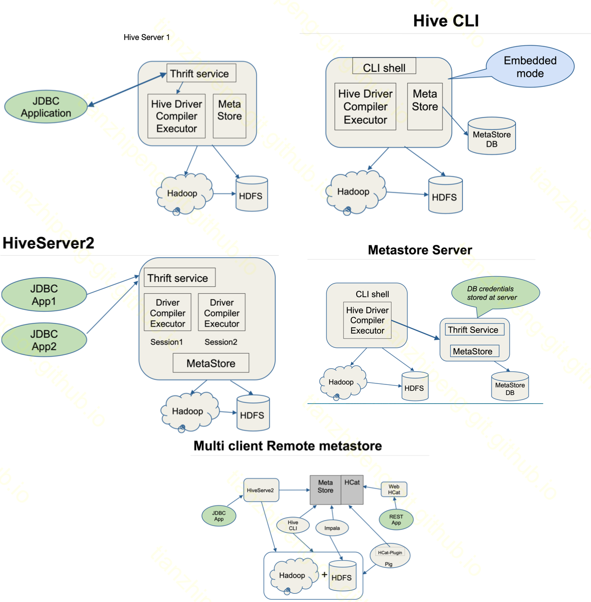 先看Hive, 下图是我从hive deployment modes文档中截取的几种模式:
