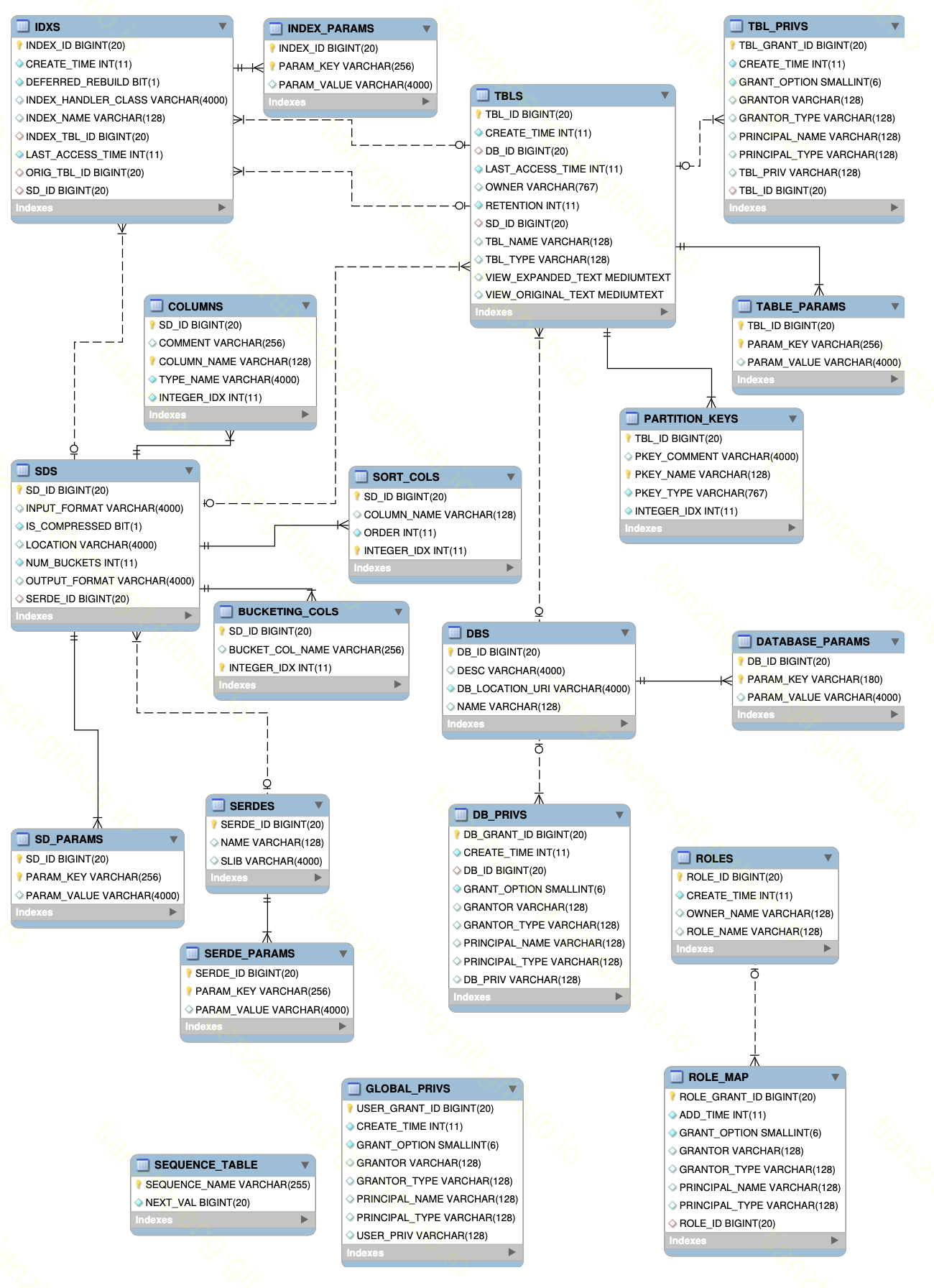 下图是MetaStore DB里的表结构(点击放大). 可以看出, 基本上就是存储上面几个东西的信息, 还有就是各种参数, 权限之类的.