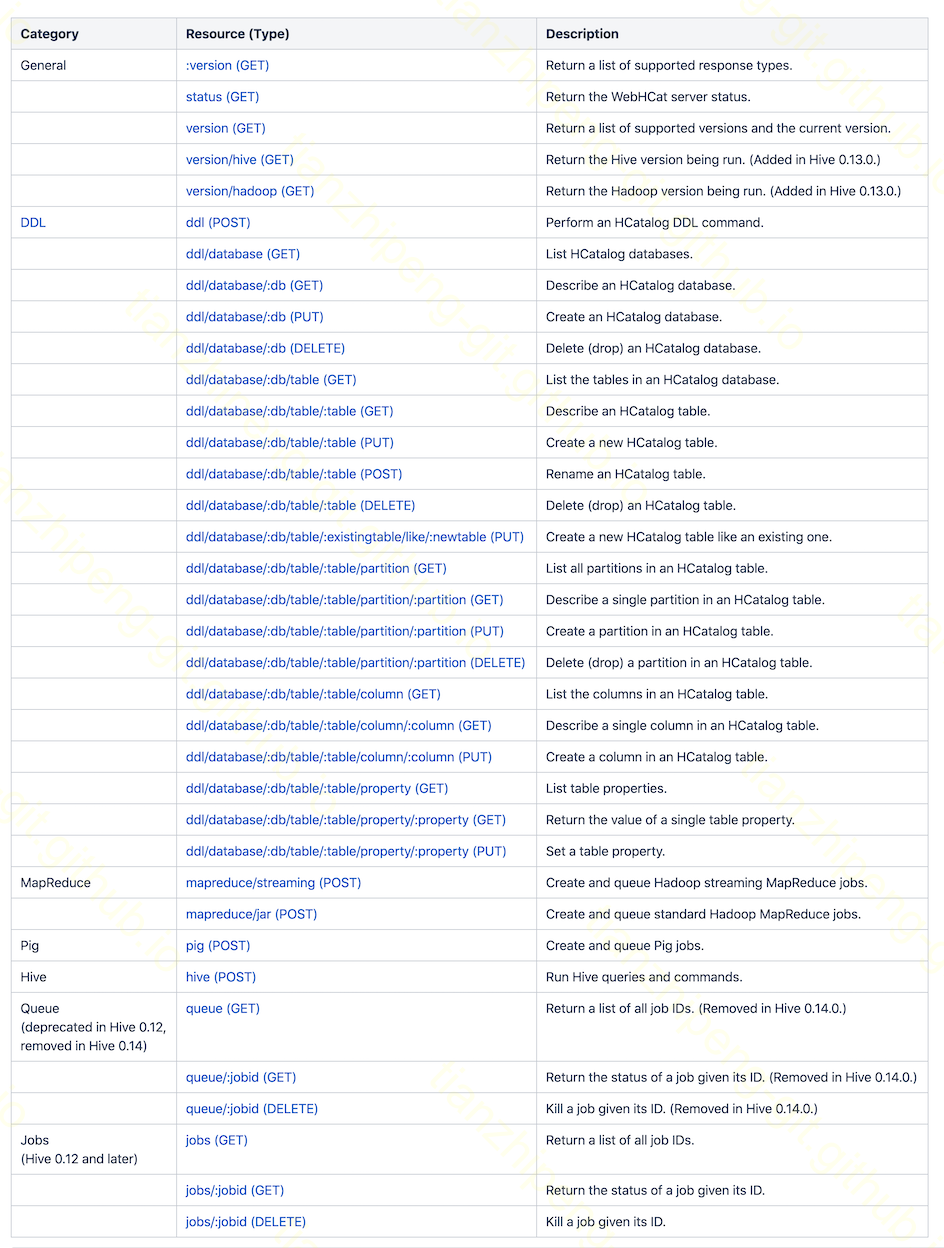 除了上述的hcat命令, HCatClientjava客户端, 还有一种管理HCatalog的方式就是部署一个WebHCat服务, 通过REST接口来管理. 其内部也上用上述client做的, 对外提供的REST接口如下: